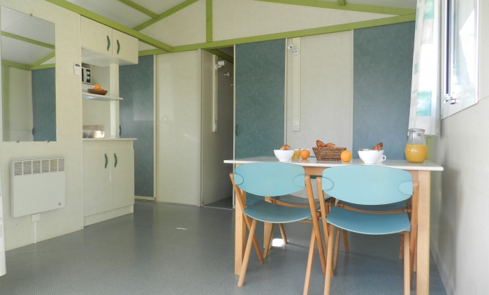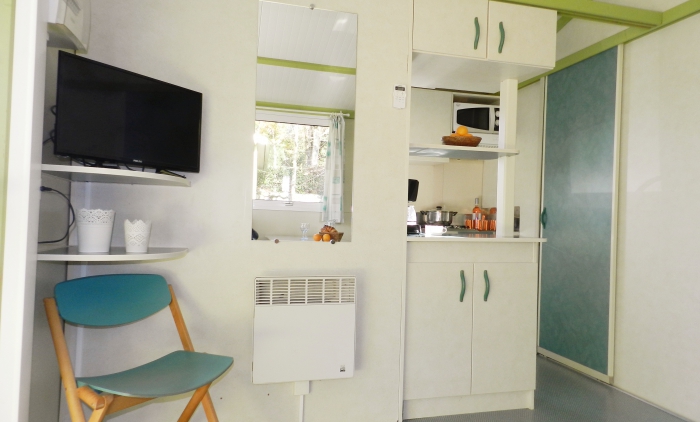 - Cuisine équipée: frigo top avec compartiment à glaçons, réchaud gaz, micro onde, vaisselle, cafetière Senseo…
